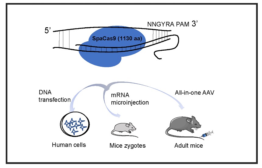 由于目前广泛使用的基因组编辑工具SpCas9超过4.7kb,难以应用于All-in-one AAV介导的基因治疗;而其他小Cas9也面临着效率较低、复杂PAM限制等问题。针对该科学问题,课题组重新鉴定和优化出一种小Cas9基因编辑系统-SpaCas9。经优化后SpaCas9,具有独特的NNGYRA PAM,显著提高了基因编辑效率及特异性。进一步利用优化的SpaCas9系统,成功构建了白化病的基因编辑动物,并应用于All-in-one AAV介导的基因治疗,成功地将导致低密度脂蛋白胆固醇升高的PCSK9基因关闭,证明了该系统应用于基因治疗的潜力,也为靶向肝脏以及其他器官的基因编辑,提供了新的,理想化的基因编辑工具。