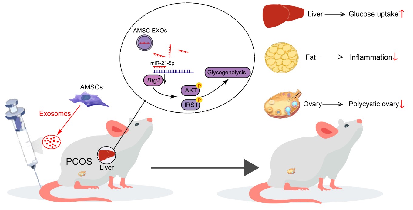 近年来,周虚教授课题组围绕PCOS治疗和发病机制展开了深入系统的研究。在本研究中,利用大鼠模型,首次从脂肪间充质干细胞(Adipose-derived mesenchymal stem cells,AMSCs)角度观察其对PCOS的治疗效果,并深入解析了作用分子机制。研究发现,AMSCs能显著改善PCOS症状,其作用机制是AMSC通过释放携带miR-21-5p的外泌体靶向Btg2基因,激活了p-IRS1和p-AKT通路,促进肝细胞对葡萄糖的摄取能力,最终达到治疗PCOS的效果。研究结果为干细胞用于临床治疗PCOS提供了新思路,也为研究动物卵泡囊肿的防治奠定了理论基础。