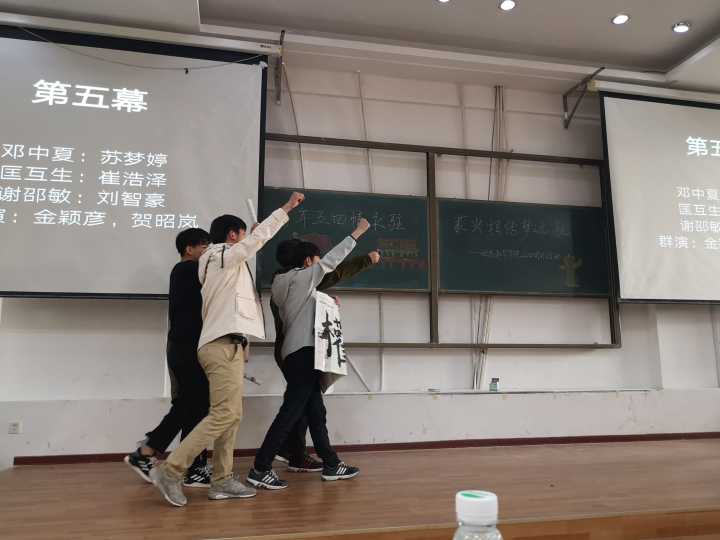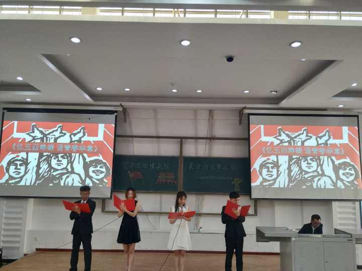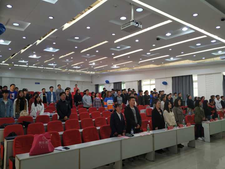 与会人员入座后,本次团日活动开始。主持人致开幕词、介绍到场嘉宾,拉开了活动序幕。活动伊始,工作人员组织同学们观看了五四运动一百周年相关视频,视频通过影像信息带着观众回顾了五四运动的起始与经过,为活动营造了充满红色记忆的氛围。接下来进行了由18级的四位同学讲说微团课《五四风雷》、情景短剧《新时代,新青年——致敬五四》、诗朗诵《忆五四峥嵘,诵青春华章》、观看快闪视频《少年中国说》等活动项目。回忆往日五四历史,立足当下砥砺前行,唤醒了同学们心中的爱国情怀。在互动环节中,同学们抒发了自己在活动中的感想,展望未来、立足当下。最后由肖建荣老师总结陈辞,在总结中,肖建荣老师表达了对此次活动顺利开展的肯定,对五四精神进行了加入时代元素的升华,同时也表达了对同学们在今后的学习生活中继续发扬五四精神、传承民族爱国精神的希望。最后,在全体参会人员的团歌声中,本次团日活动圆满结束。