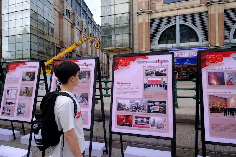 团队第一站来到了“东北抗联精神、北大荒精神、大庆精神、铁人精神”专题展。专题展由黑龙江省委宣传部、黑龙江省文化和旅游厅主办,在哈尔滨中央大街面向社会展出。专题展共分为4个部分,用23块展板、169幅珍贵历史图片等翔实的史料和鲜活的事例,深刻阐释了以“四大精神”为代表的黑龙江优秀精神的历史脉络、深邃内涵和时代意义。团队成员驻足在展板前,认真观看每个展板的内容,品读并感受着每一块展板背后的历史故事,并将其内化于心。