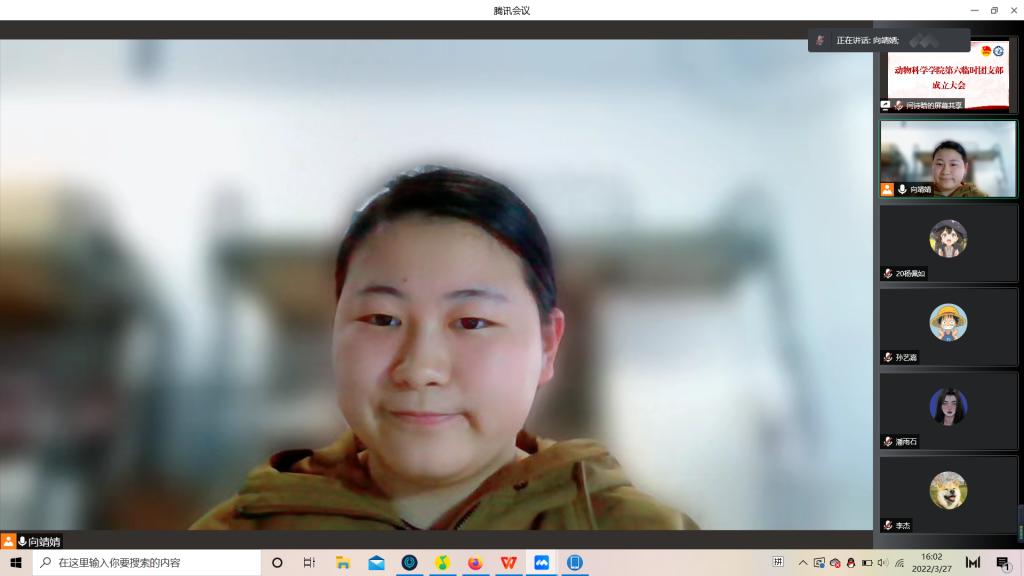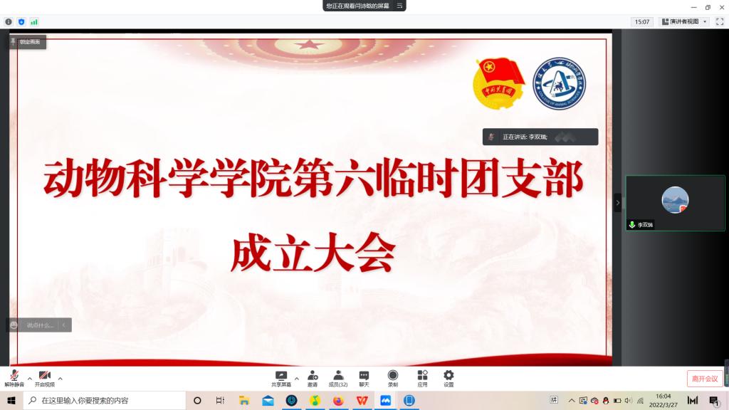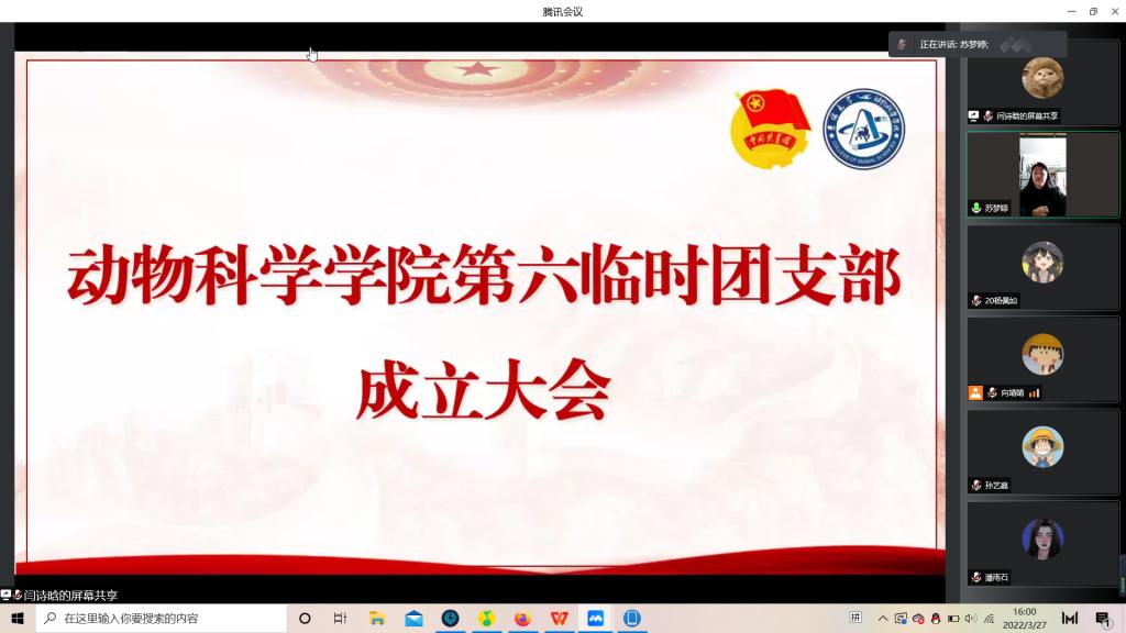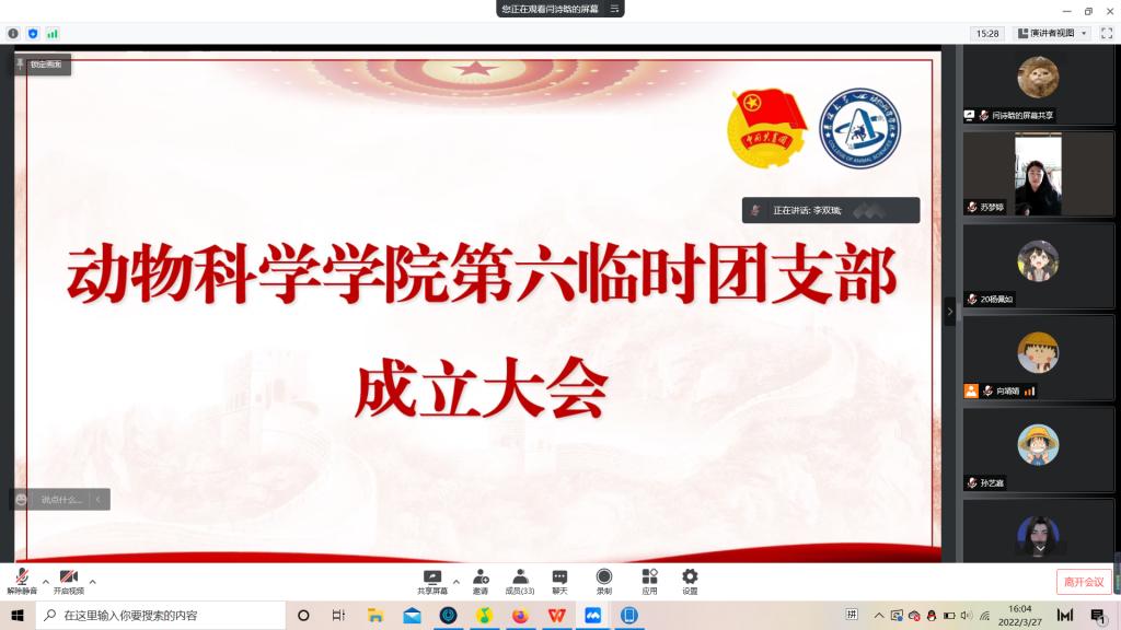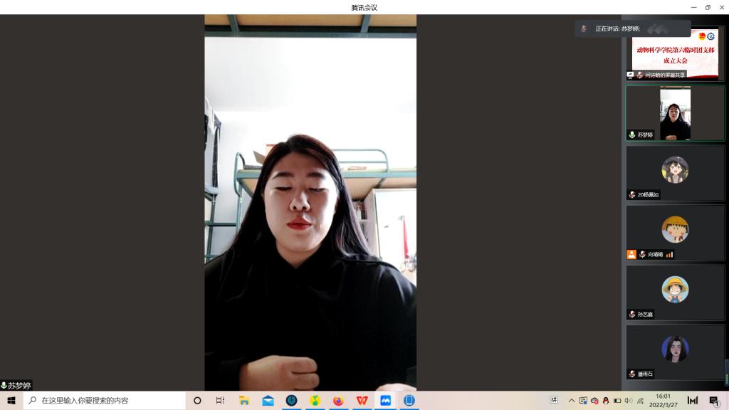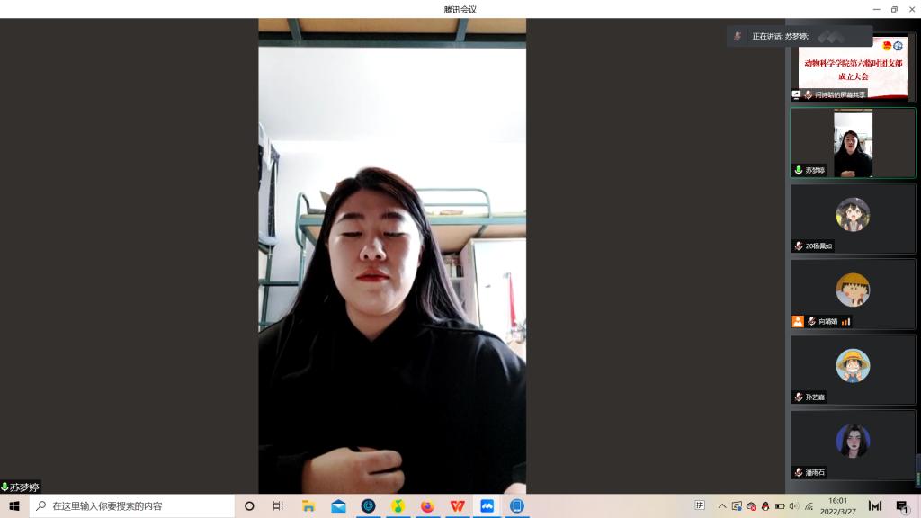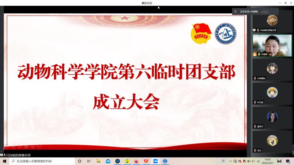 为积极响应校团委号召,强化团的基层建设,切实发挥共青团组织在防疫控疫工作中的战斗堡垒作用及团员的先锋模范作用,落实《关于疫情防控期间成立临时团支部的通知》的工作安排,永利集团304官网第六临时团支部成立大会于3月29日下午四点由支部书记苏梦婷主持召开。支部全体成员即2018级、2019级实验动物班和2020级一班和平二公寓共34名同学参会。