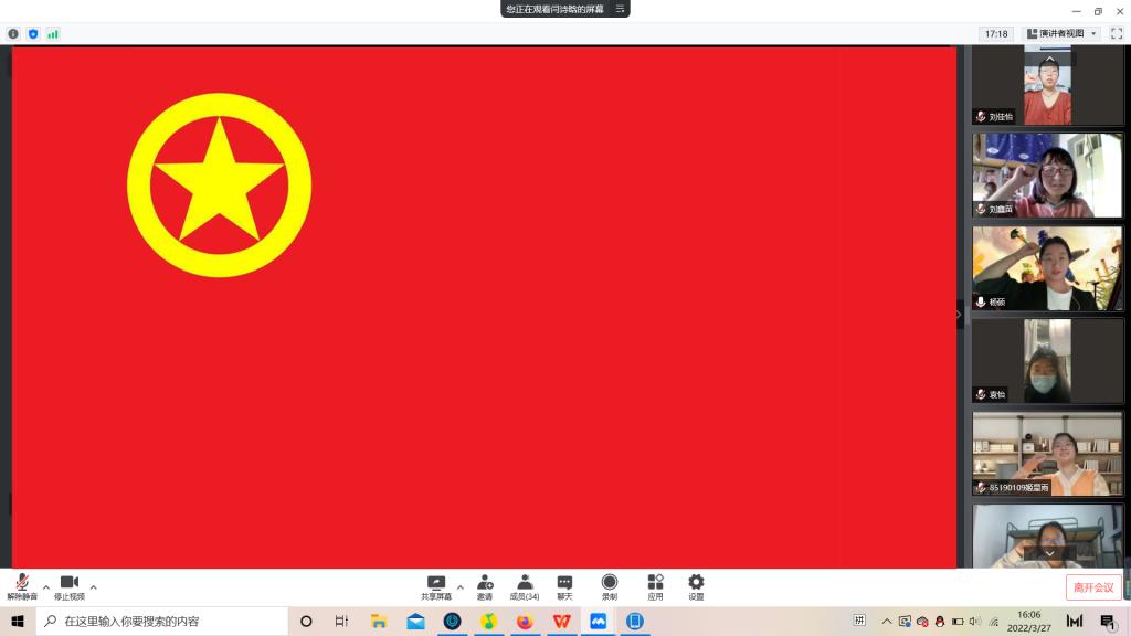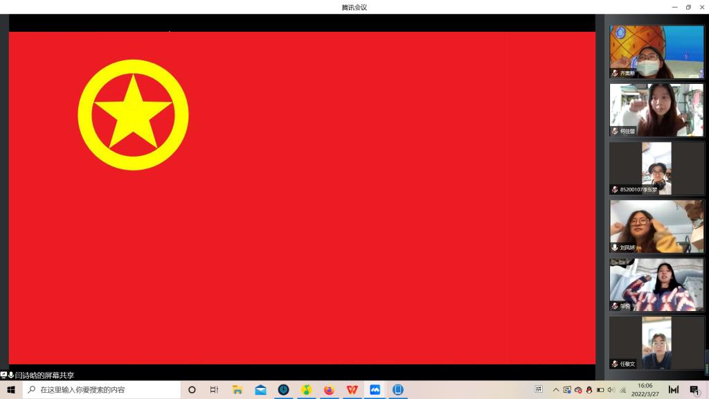 随后,积极参与到本次疫情防控志愿服务工作中的两位团员代表向大家分享了心得,于淞同学首先发言分享了自己参与志愿工作中所感受到的大家共抗疫情的坚定决心,并提出吉林终有吉临时,长春定复往常春的美好期待。李双瑞同学分享了自己在工作中和同组志愿者的故事,大家互帮互助,在自己的能力范围内,尽可能承担更多的的工作,更好的配合公司,满足大家的生活需求。会议结尾,由支部委员闫诗晗带领支部全体成员在团旗下高举右手紧握右拳庄严宣誓。