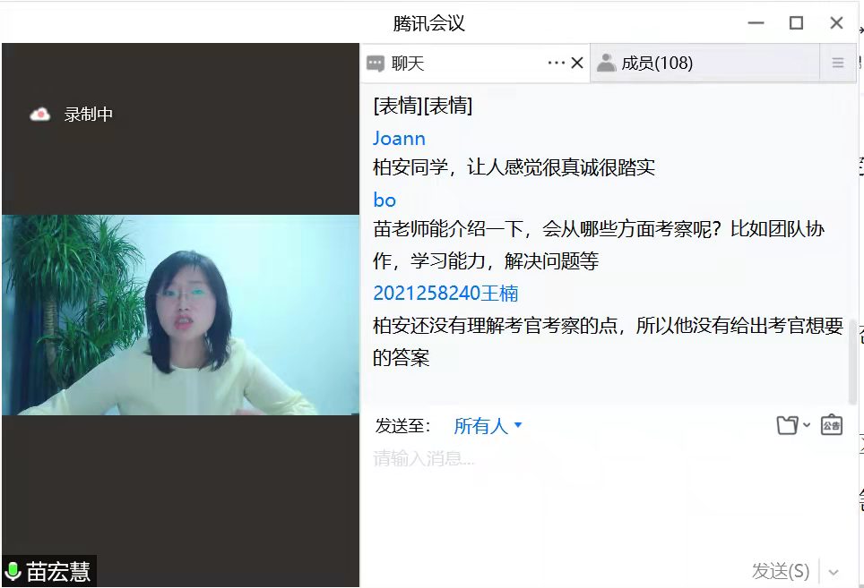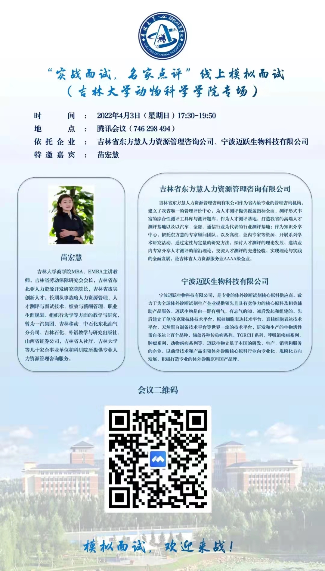4月3日,公司开展“实战面试 名家点评”线上模拟面试会,邀请永利304官网商学与管理公司人力资源管理专家苗宏慧老师,宁波迈跃生物科技有限公司总经理、优秀员工牛伟萍女士在线指导,公司180余名师生参会。