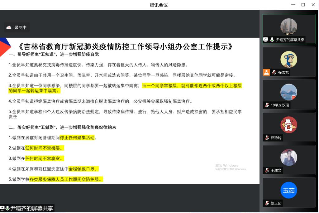 会上,辅导员尹暄齐老师首先向同学们解读吉林省教育厅新冠肺炎疫情防控工作领导小组办公室工作提示,即要求同学们了解遵守“五知道、五做到”。随后,尹暄齐老师就目前每日健康打卡的情况进行通报并落实相关工作安排,强调每位同学要对此高度重视,及时打卡。最后,他强调:全体同学应体谅志愿者工作的不易,尤其是员工干部和员工党员要明确身份、以身作则,在疫情防控工作中带头遵守疫情防控的各项管理规定,积极参加各公寓的志愿服务,展现担当精神,让青春之花在抗疫一线绽放。