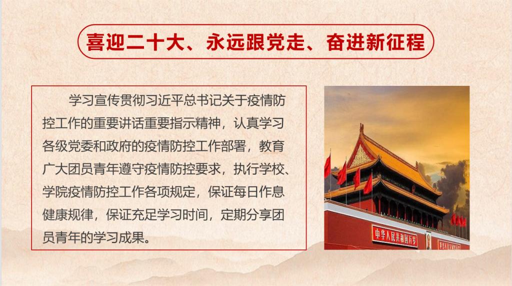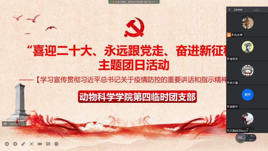 为进一步落实学习宣传贯彻习近平总书记关于疫情防控工作的重要讲话重要指示精神,认真学习各级党委和政府的疫情防控工作部署,教育广大团员青年遵守疫情防控要求,执行公司、公司疫情防控工作各项规定,永利集团304官网第四临时团支部于2022年4月3日下午19时,依托腾讯会议开展“喜迎二十大、永远跟党走、奋进新征程”主题团日活动。永利集团304官网第四临时团支部全体同学积极参与。活动由团支书巩永博主持。