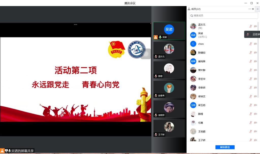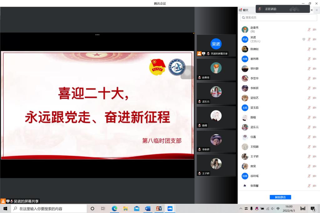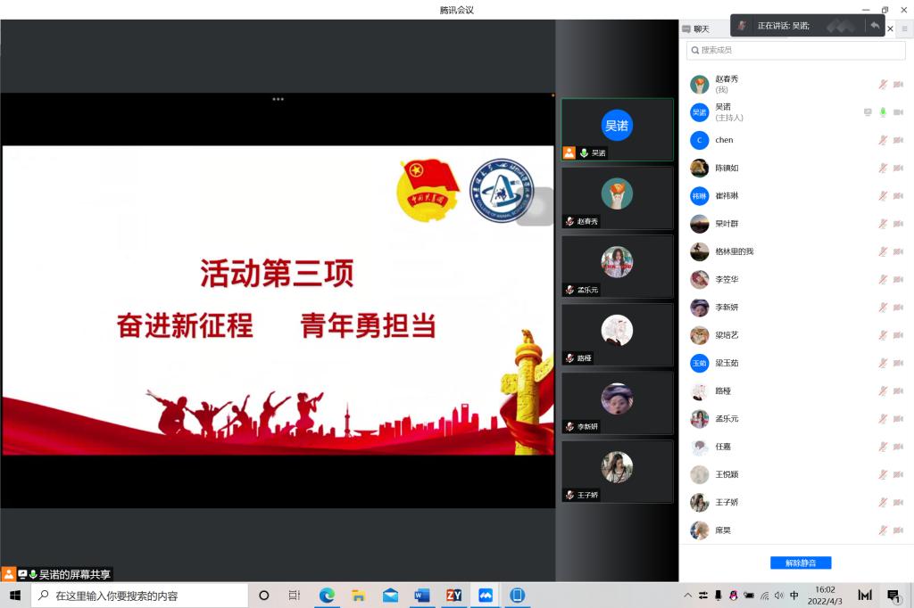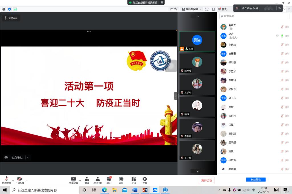 今年是中国共产主义青年团成立一百周年,是党的二十大召开之年,也正是抗疫防控的关键时刻。为贯彻落实“两会”精神,迎接二十大召开,引领广大团员青年坚定跟党走、成才报国信念,教育广大团员青年遵守疫情防控要求,2022年4月3日,永利集团304官网第八临时团支部开展“喜迎二十大、永远跟党走、奋进新征程”主题团日活动,永利集团304官网第八临时团支部全体同学积极参与本次活动。活动由团支书吴诺主持。