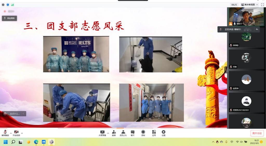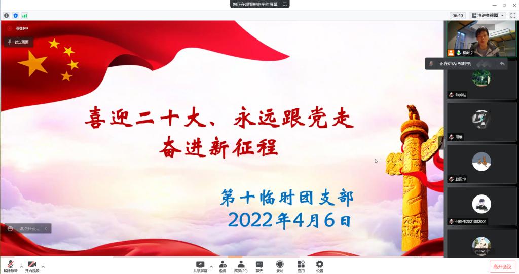 为学习贯彻习近平总书记关于疫情防控工作的重要指示精神、认真学习各级党委和政府的疫情防控工作部署,教育广大团员青年遵守疫情防控要求,执行公司、公司疫情防控工作各项规定,保证每日作息健康规律,保证充足学习时间。永利集团304官网第十临时团支部于4月6日晚6时召开“喜迎二十大,永远跟党走,奋进新征程”为主题的团日活动。此次会议采取线上腾讯会议的形式举行,第十临时团支部全体团员参与了此次活动。会议由团支部副书记任中帅主持。