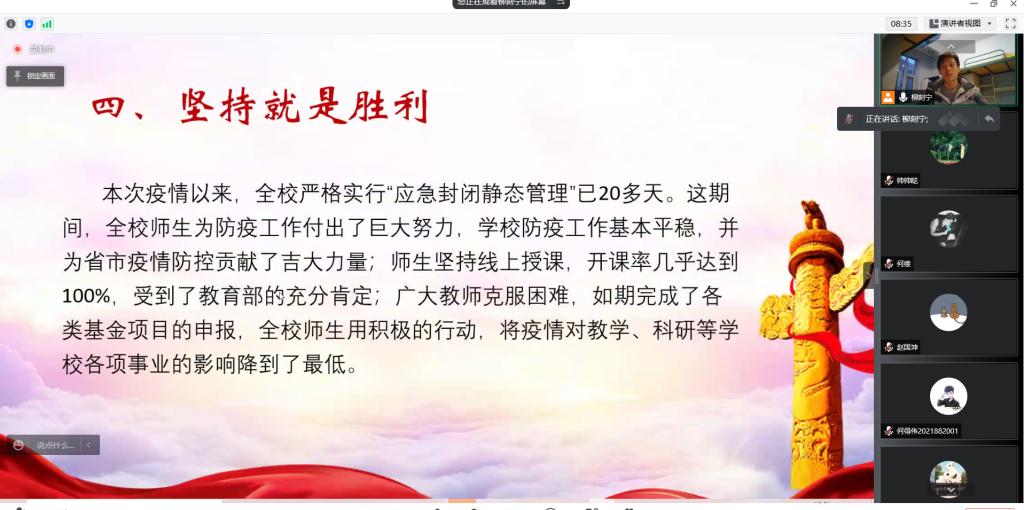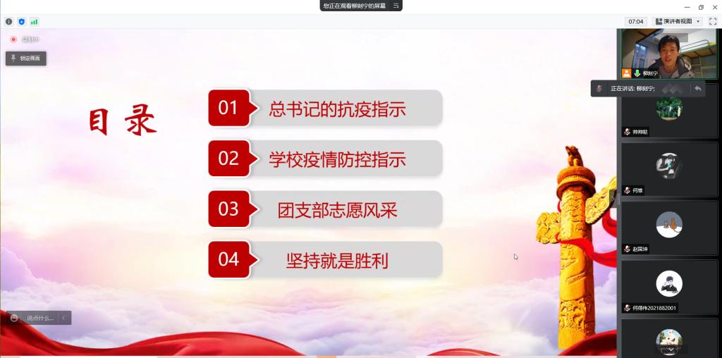 随后,团支部书记柳刻宁围绕总书记的抗疫指示、公司疫情防控指示、团支部志愿风采、坚持就是胜利等四个方面进行讲解。