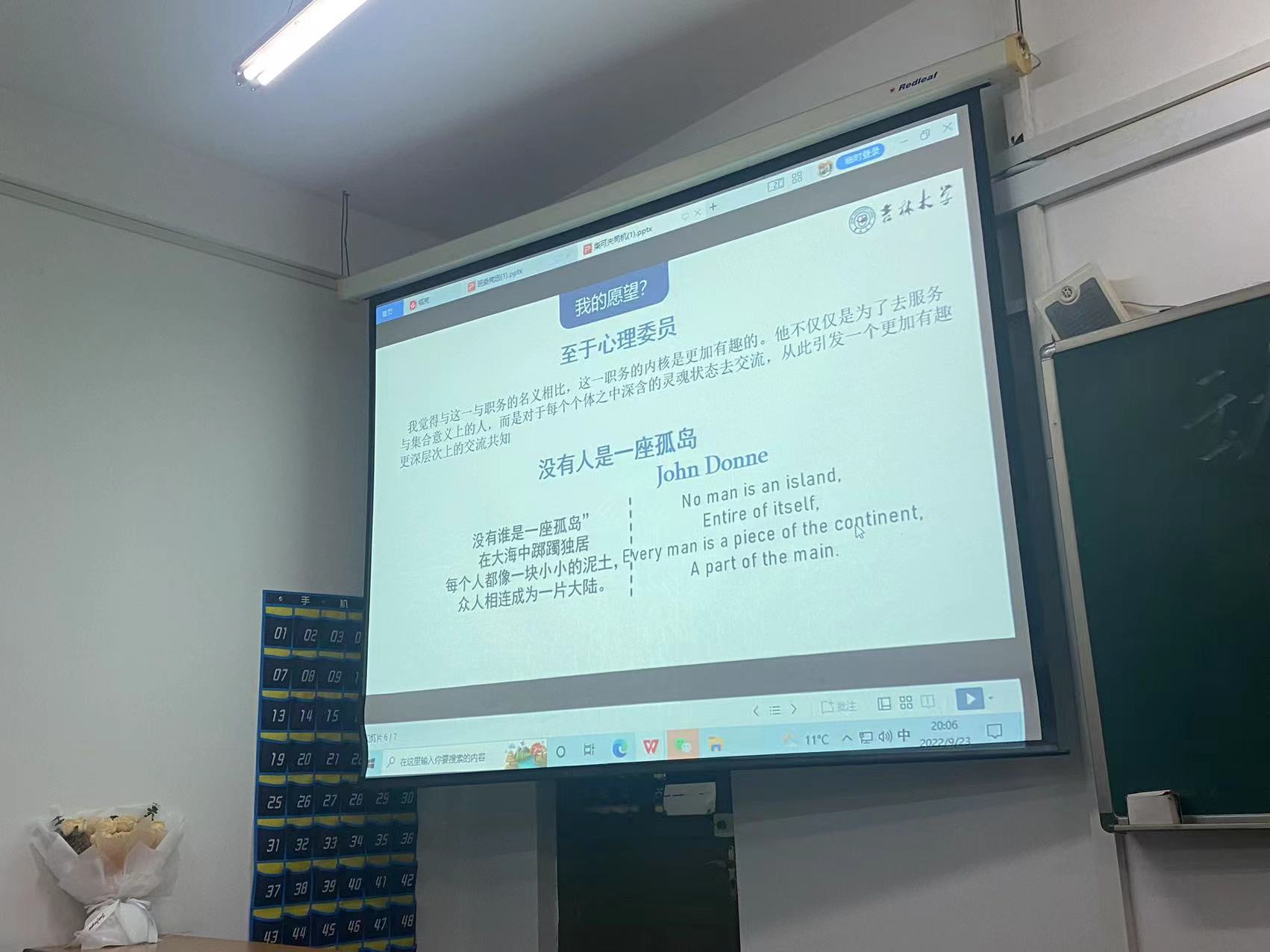 为了保证新生班级工作的有序开展,加强班级凝聚力和向心力,永利集团304官网2022级三个本科生班级于9月下旬在和平校区科学讲堂先后开展第一次线下班会暨班团干部竞聘活动。各班班主任、辅导员及辅导员助理均到场参加各班班会,班会由各班新生辅导员助理主持。