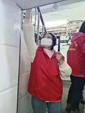 (图为志愿者清洁楼梯、门上的广告)