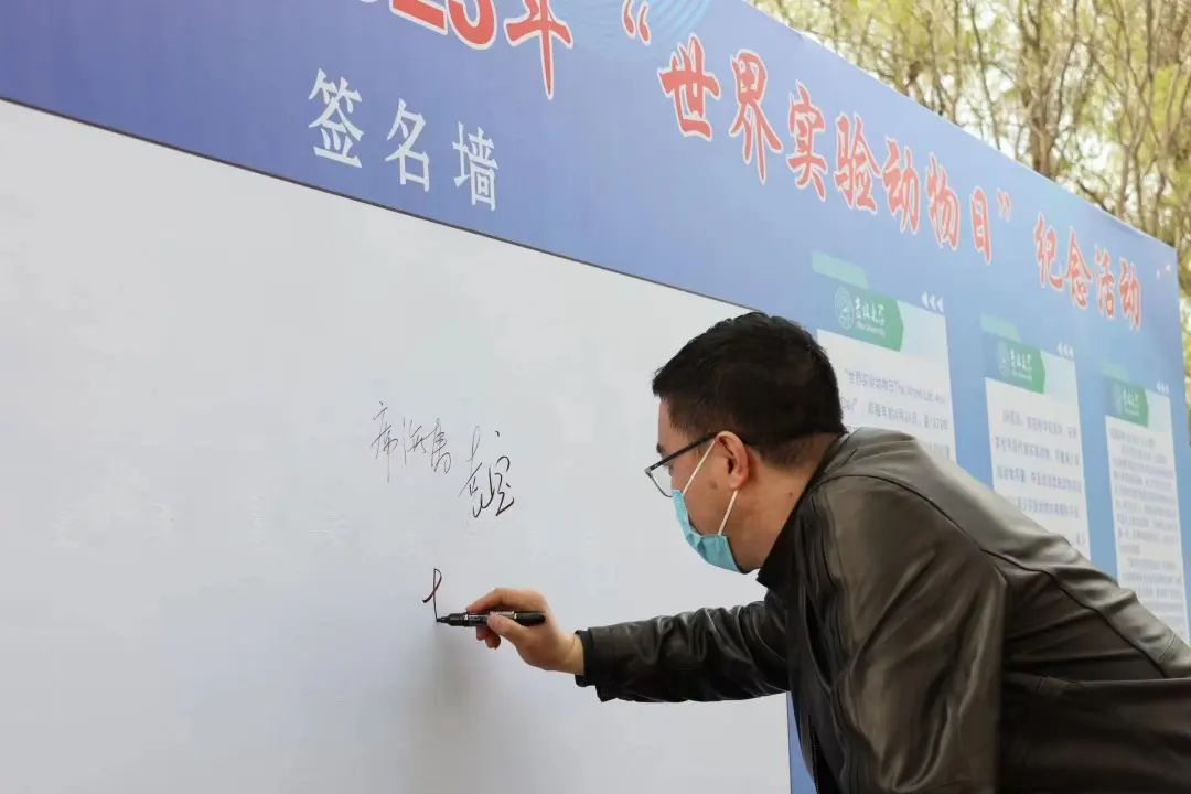 随后,席海涛处长代表实验室管理处向专程前来参加仪式的各位师生表示敬意。席处长高度评价了实验动物在疫情期间为我国新冠疫苗、药物研发过程中做出的巨大贡献,以及在公司封控时期,实验动物中心全体工作人员为保障公司实验动物生物安全做出的辛苦付出。他强调,永利304官网每年实验动物使用量超10万只,善待实验动物,维护实验动物福利和伦理是每一个科学工作者的责任,也是人类理智与情感的升华。他向同学们寄语,希望同学们在今后的学习、科研过程中,严格遵守《实验动物管理条例》,遵守动物实验相关规定,科学合理地设计实验方案,感恩实验动物的伟大奉献,更加努力地学习生命科学知识,不辜负实验动物的付出。