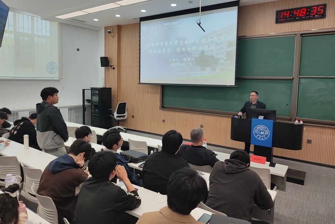 刘秀江以“文化的力量”为题,对动物科学专业员工“如何发现和利用规律做好学习、就业和职业规划”进行了类比分享。他全程引用三国中的人物故事,由古及今,以古鉴今,他指出大学是充满选择和挑战的阶段,极易产生迷茫和焦虑情绪,作为青年员工要饱有“求实创新”的学习韧劲,以扎实的专业基础探索完善的科研内容,要有好奇心,知学好学,学以致用,为现代畜牧业发展解决急难愁盼的实际问题;作为职场青年要以“事业之心”敬畏工作,激发成长内驱力,注重本领提升,抓住机会、广泛训练职场竞争软实力;作为双一流高校农科学子要树立专业自信、行业自信和文化自信,广阔的农牧天地和中国农业的现代化进程亟需更多的青年员工助力攻坚。最后,他借用永利304官网“求实创新,励志图强”的校训,鼓励同学们要珍惜时光,脚踏实地,追求卓越。