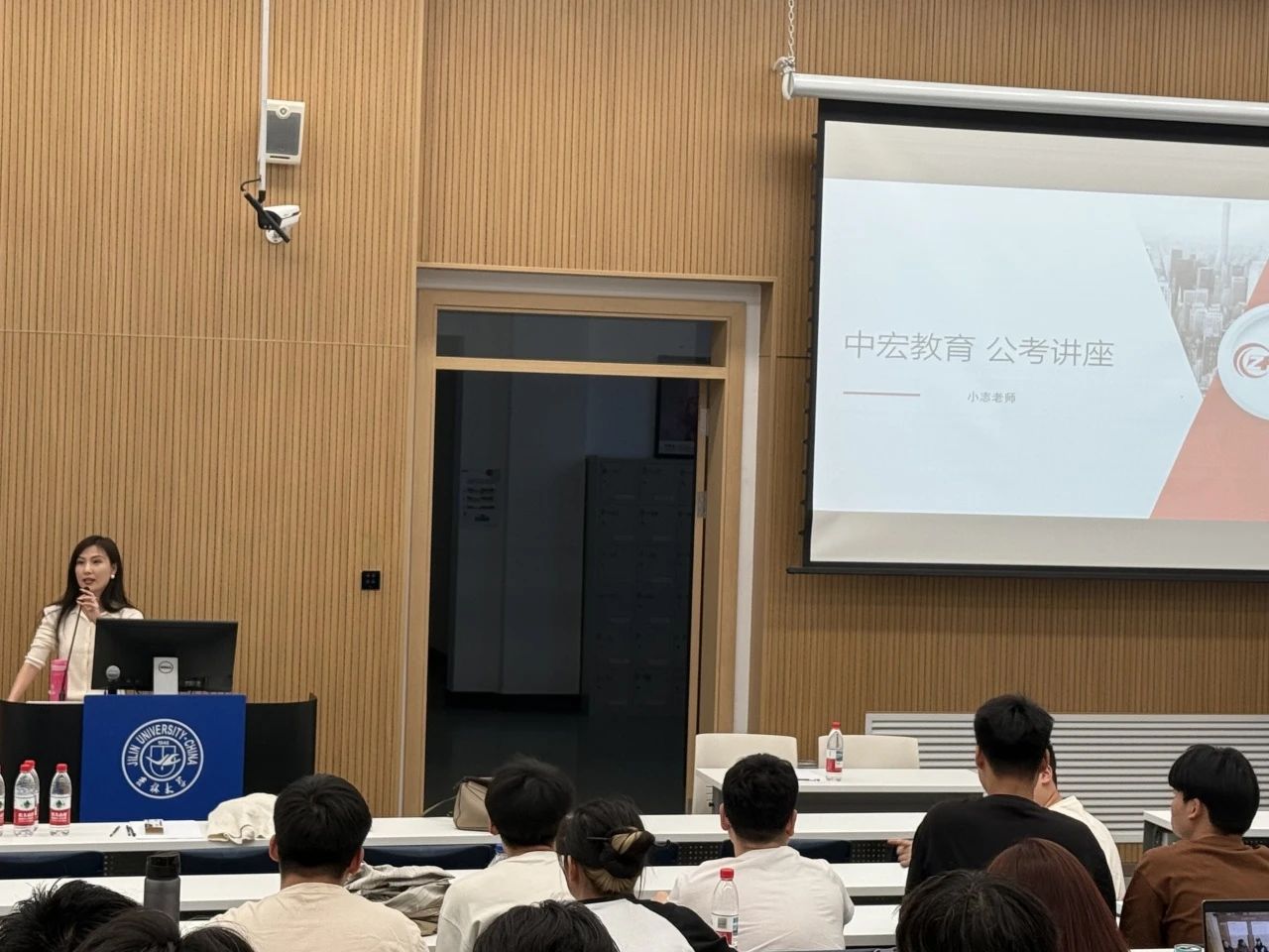 然后,中宏教育资深面试培训专家张鹏志老师为同学们系统讲解了公务员面试的核心要点与应试技巧。张老师以其丰富的教学经验和实战经验,深入浅出地分析了面试中可能遇到的问题,并提供了实用的应对策略。他建议同学们注重面试礼仪和穿着,面试时思考时间不宜过长,答题时抬头并且声音洪亮,论述时不仅要仔细审题,也要接地气避免假大空,适当结合好词好句等,这使同学们受益匪浅。