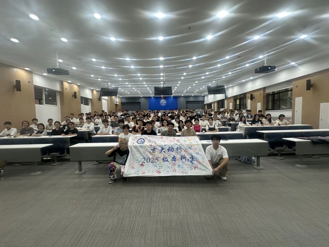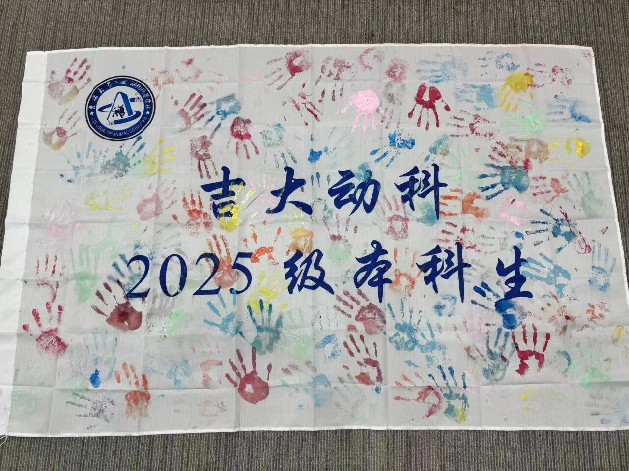在会议临近结束时,动科学子们依次上前,于印有公司院徽的旗帜上留下了各自的手印。印满手印的年级旗帜不仅标志着他们已经成为动科大家庭的一份子,更是动科2025级本科新生团结一致精神的显著体现。