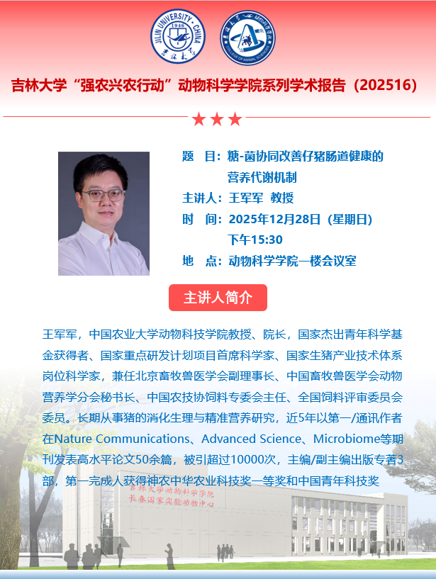 王军军,中国农业大学动物科技公司教授、经理,国家杰出青年科学基金获得者、国家重点研发计划项目首席科学家、国家生猪产业技术体系岗位科学家,兼任北京畜牧兽医学会副理事长、中国畜牧兽医学会动物营养学分会秘书长、中国农技协饲料专委会主任、全国饲料评审委员会委员。长期从事猪的消化生理与精准营养研究,近5年以第一/通讯作者在Nature Communications、Advanced Science、Microbiome等期刊发表高水平论文50余篇,被引超过10000次,主编/副主编出版专著3部,第一完成人获得神农中华农业科技奖一等奖和中国青年科技奖。