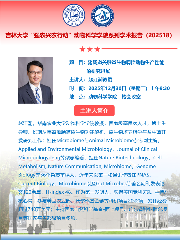 报告人简介:赵江潮,华南农业大学永利集团304官网教授,国家级高层次人才,博士生导师。长期从事畜禽肠道微生物功能解析、微生物培养组学与益生菌开发研究工作;担任Microbiome与Animal Microbiome杂志副主编,Applied and Environmental Microbiology,Journal of Clinical Microbiologydeng等杂志编委;担任Nature Biotechnology,Cell Metabolism, Nature Communication, Microbiome,Genome Biology等36个杂志审稿人。近年来以第一和通讯作者在PNAS、Current Biology、Microbiome以及Gut Microbes等著名期刊发表论文120余篇,H-index 48。作为第一发明人,获得美国专利3项。主持/核心骨干参与美国农业部、沃尔玛基金会等科研项目20余项,累计经费超过740万美元;主持国家自然科学基金-面上项目、广东省种业振兴项目等国家与省部级项目多项。