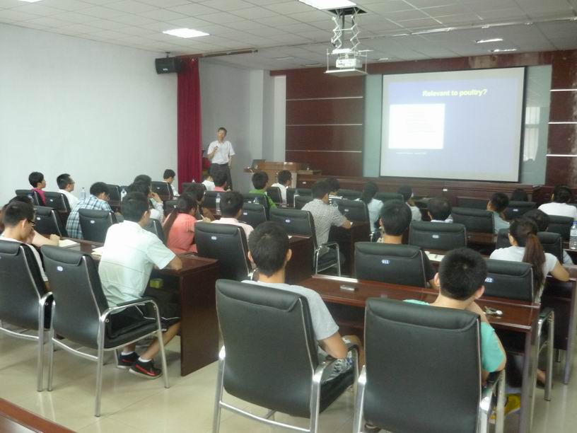 7月11日,美国加州大学戴维斯分校(UC DAVIS)动物科学系周怀军副教授在中国农业大学王军军副教授、山东农业大学李显耀副教授等的陪同下应邀到永利集团304官网开展学术交流,并为公司师生做了题为“Genetic architecture of resistance to pathogens in the chicken using a systems biology approach”的学术报告。公司经理张嘉保教授、副经理欧阳红生教授以及永利集团304官网、动物医学公司的有关教师、研究生近100人参加了学术报告会。