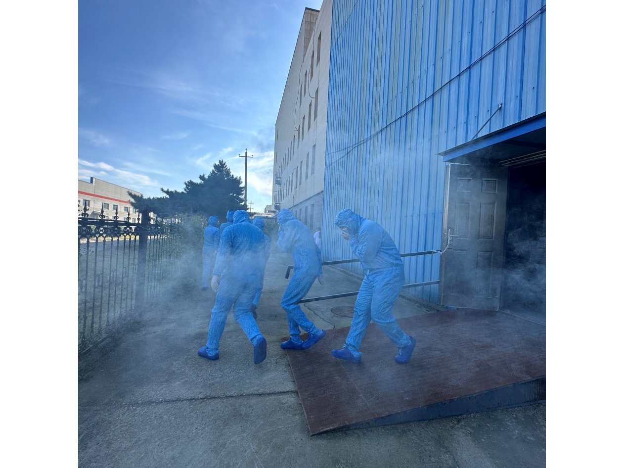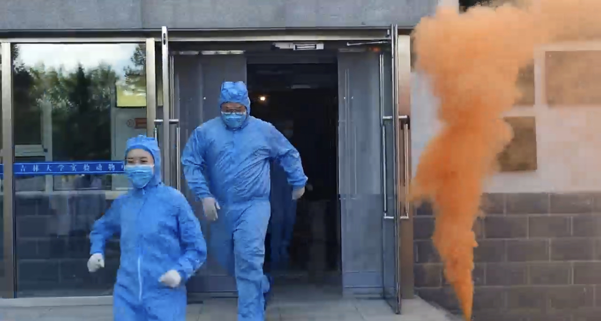 演练开始,实验动物屏障环境设施外围突发较大火情,值班人员发现烟雾报警后,立即在自己所在的楼层通过喇叭示警,同时高声喊话提醒,并告知公司值班室人员立即切断公司总电源。在只有应急照明条件下,设施内的负责老师带领员工弯腰且捂住口鼻逃离。在走廊及楼梯时,按照疏散路线靠右侧墙有秩序的迅速从安全出口撤出,到达指定地点集合,与此同时各组负责老师立即清点撤出员工人数,核对人员名单。人员全部有序安全撤离,且名单核对无误,应急逃生演练顺利完成。