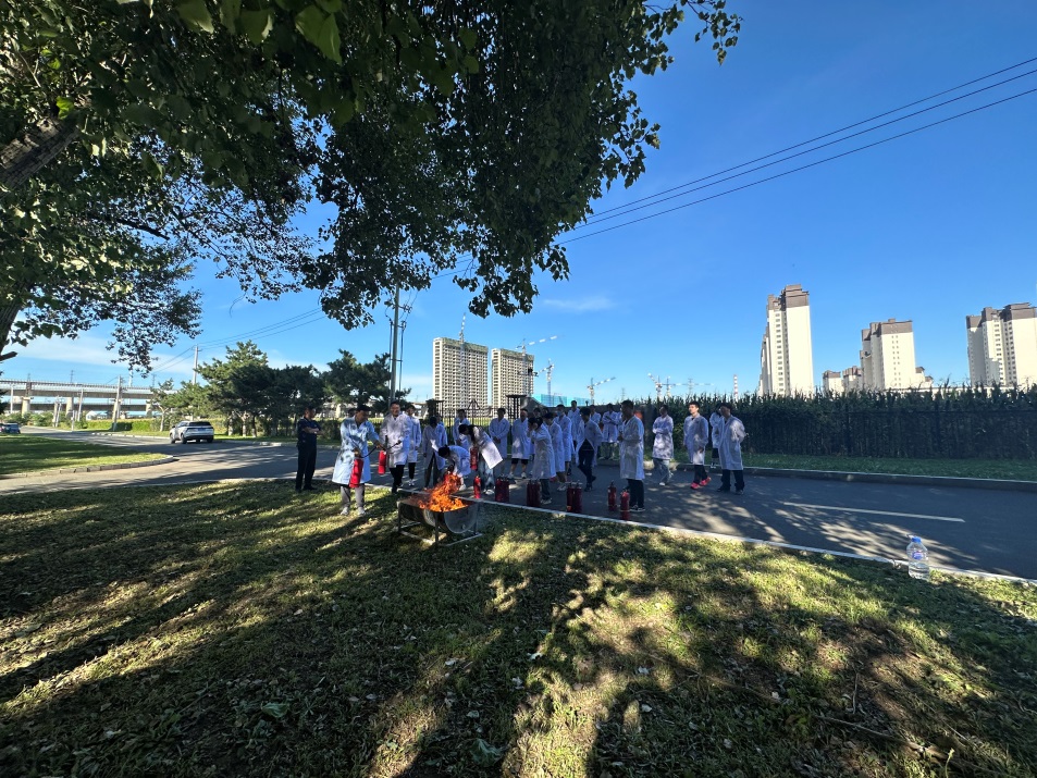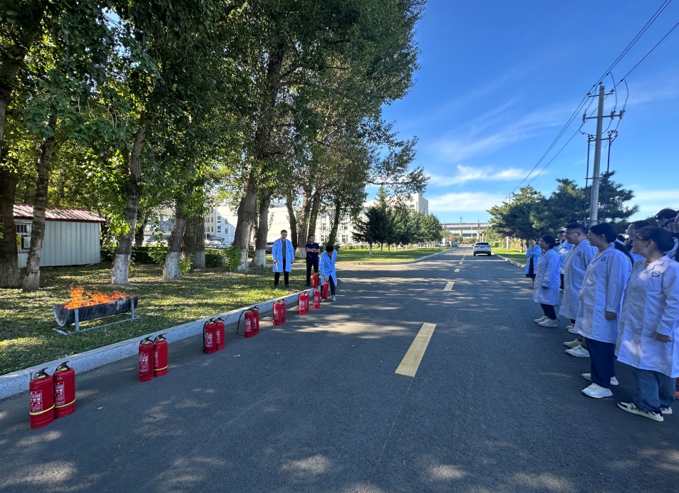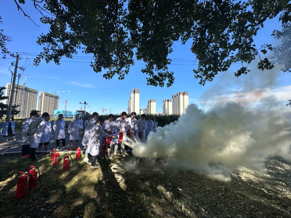 任老师讲解并示范灭火器的使用方法后,同学们在培训现场使用灭火器进行实地灭火操作。