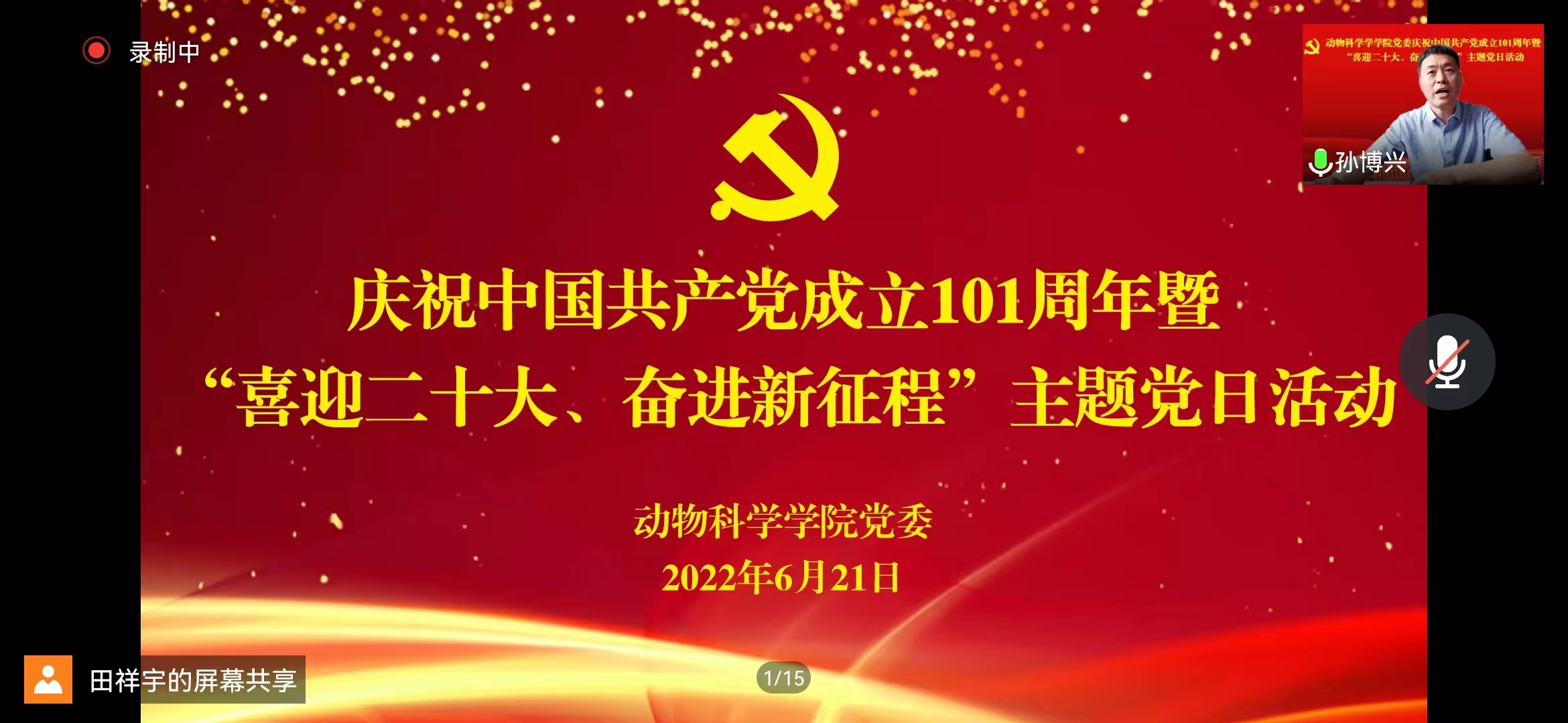 为庆祝中国共产党成立101周年,迎接党的二十大胜利召开,6月21日上午,动物科学公司党委通过腾讯会议平台线上开展庆祝中国共产党成立101周年暨“喜迎二十大、奋进新征程”主题党日活动。活动由经理孙博兴同志主持,公司全体师生党员线上参会。
