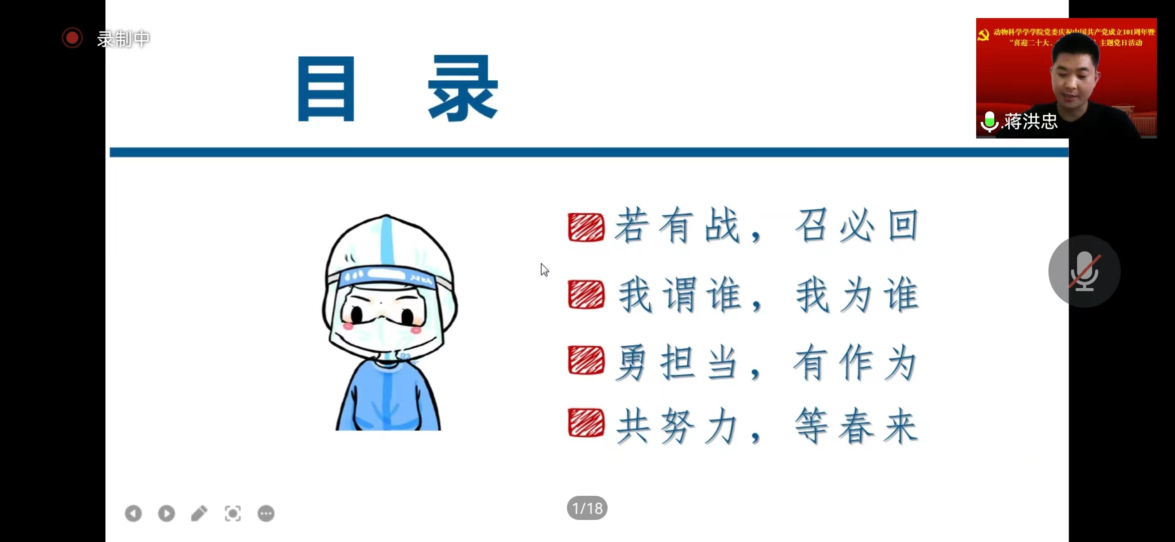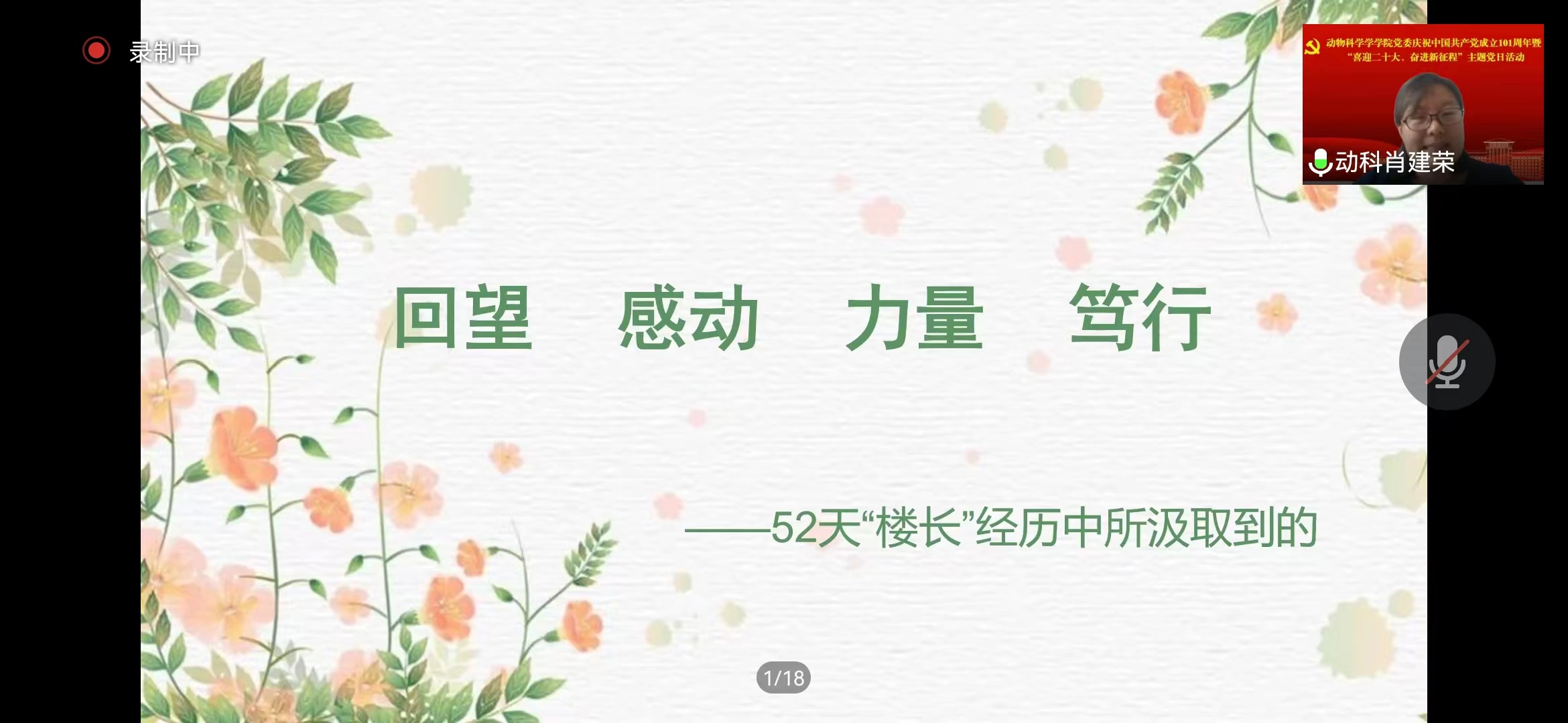 随后,公司疫情防控一线教职工党员代表肖建荣、王可佳、蒋洪忠和胡进平4位同志联合开展“党课开讲啦”,用生动的图片和鲜活的事例分享了他们在校园疫情防控和生产一线工作中的感人故事。肖建荣副书记以《回望·感动·力量·笃行》为题,分享了她带病上阵,在校园防疫一线担任52天“楼长”的感动与收获;辅导员王可佳以“春天里的故事”为题讲述了驻校时间最长、岗位变化最多的楼长与她员工们的双向奔赴;蒋洪忠老师用朴实却坚定的语言生动诠释了“召之能战、战之必胜”的“军人本色”;胡进平老师则细数公司生产一线的7位同志从冰雪覆盖到春暖花开再到夏日到来一路的艰辛与坚守......讲不完的故事,道不尽的感动,4位党员同志用他们的实际行动为公司师生筑起一道坚强的防疫屏障,他们是校园防疫一线的一抹“动科红”。